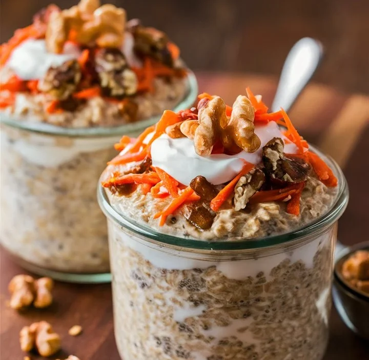 Start your day with this delicious and nutritious Carrot Cake Overnight Oats recipe! Packed with wholesome ingredients like rolled oats, grated carrots, chia seeds, and warm spices, this breakfast is as tasty as dessert but full of energy-boosting nutrients. It’s quick to prepare, great for meal prep, and perfect for a busy morning.